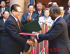 江澤民主席與南非總統(tǒng)姆貝基于二十五日共同簽署關(guān)于兩國伙伴關(guān)系的比勒陀利亞宣言。中新社記者 彭偉祥 攝