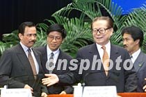 圖文:江澤民會(huì)見文萊蘇丹 2001年5月15日 15:45 ![]() 中國國家主席江澤民與文萊蘇丹博爾基亞,十五日在北京人民大會(huì)堂出席APEC人力資源能力建設(shè)高峰會(huì)開幕式。中新社記者 毛建軍 攝