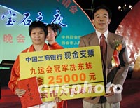 圖:廣東肇慶重獎九運(yùn)會柔道冠軍冼東妹 2001年12月09日 18:58 ![]() 廣東肇慶四會籍選手冼東妹(左)在九運(yùn)會上奪得五十二公斤級柔道冠軍,肇慶四會市特別獎勵她25000元人民幣。圖為市委書記龍紅輝八日親手把現(xiàn)金支票送到冼東妹手中。中新社圖 黃耀輝 攝 |