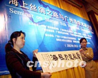圖:廣州是“海上絲綢之路”的最早始發(fā)港 2002年01月12日 19:13 ![]() “海上絲綢之路與廣州港學(xué)術(shù)研討會”十二日在廣州舉行,據(jù)專家、學(xué)者論證,魏晉時期從廣州啟航到東南亞各國的航道就已開通,廣州是海上絲綢之路的始發(fā)大港。圖為香港知名學(xué)者饒宗頤向研討會送上“聲教訖于四!钡臋M幅。中新社圖 羅仰明 攝 |