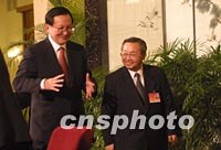 ![]() 中國外交部長唐家璇與九屆全國人大五次會(huì)議新聞發(fā)言人曾建徽,六日走出人民大會(huì)堂記者招待會(huì)現(xiàn)場。唐家璇在會(huì)上說,中國入世有利于香港繼續(xù)維持包括國際金融中心在內(nèi)的三個(gè)國際中心地位。中新社記者 劉殊瑾 攝