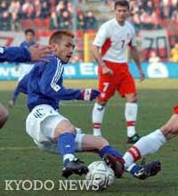 圖文:中田英壽大放異彩 日本隊(duì)2比0完勝波蘭隊(duì) 2002年03月28日 10:44 ![]() 日本國(guó)家隊(duì)頭號(hào)球星中田英壽率領(lǐng)球隊(duì)擊垮歐洲老牌勁旅波蘭隊(duì)(圖/共同社) 中新網(wǎng)巴黎3月28日消息:當(dāng)?shù)貢r(shí)間27日傍晚,日本足球隊(duì)與波蘭足球隊(duì)進(jìn)行了一場(chǎng)國(guó)際友誼賽,日本隊(duì)以2比0完勝對(duì)手。繼21日和烏克蘭隊(duì)交手之后,這是日本隊(duì)在強(qiáng)化比賽中的二連勝。 比賽中日本發(fā)揮出色,在場(chǎng)面上完全壓倒在歐洲賽場(chǎng)戰(zhàn)績(jī)不俗的波蘭隊(duì)。上半場(chǎng)第10分鐘,剛剛和主教練特魯西埃重歸于好的中田英壽首先破門(mén),為日本取得領(lǐng)先優(yōu)勢(shì)。第42分鐘時(shí),在阿根廷博卡青年隊(duì)效力的年輕前鋒高原直泰再下一城,使日本隊(duì)以2比0完勝對(duì)手。 賽后,日本隊(duì)主教練特魯西埃對(duì)比賽進(jìn)行了總結(jié),他分析比賽勝利的原因是:自從去年0比5慘敗給法國(guó)隊(duì)后,球隊(duì)吸取了教訓(xùn)。大家對(duì)日本隊(duì)完全壓制住波蘭隊(duì)特點(diǎn)充滿(mǎn)了自信,這非常好。正在歐洲效力的四名隊(duì)員表現(xiàn)也相當(dāng)不錯(cuò)。小野和中田英壽配合的很嫻熟,鈴木隆獻(xiàn)身般的拼搶也很突出。