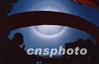 圖:福州突現(xiàn)日暈外“暈”奇觀 2002年04月14日 19:08 ![]() 十三日上午福州上空出現(xiàn)一道瑰麗的奇觀:在燦爛的太陽周圍有一個(gè)耀眼的光環(huán)。半小時(shí)過后,出現(xiàn)一個(gè)相對(duì)顏色淺一些的光環(huán)(如圖)。十幾分鐘后,光環(huán)漸漸淡去,這種美麗奇觀前后持續(xù)了約一個(gè)多小時(shí),讓觀者嘖嘖稱奇。據(jù)省氣象臺(tái)說;這種現(xiàn)象在氣象學(xué)中稱“日暈”,對(duì)天氣沒有什么影響。中新社圖 楊婀娜 攝