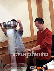 剛剛獲得格萊美獎的知名音樂家譚盾十七日現(xiàn)身滬上,并帶來了他獨(dú)特的“多媒體音樂”。圖為譚盾通過自己發(fā)明的半球形透明水盆,和外國音樂家一起演奏《永恒之水協(xié)奏曲》。孫璐 攝