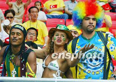 圖:女球迷身穿比基尼觀看巴西與土耳其比賽 2002年06月03日 17:12 6月3日下午,韓日世界杯C組巴西與土耳其隊的比賽正在韓國蔚山文竹體育場進(jìn)行。圖為看臺上身穿比基尼的女球迷。