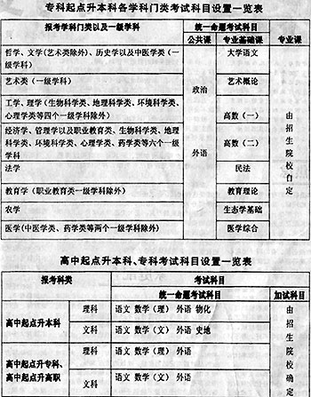 全國成人高考科目設(shè)置明年將作進一步調(diào)整(附表) 2002年06月05日 16:09 ![]() 中新網(wǎng)北京6月5日消息:據(jù)中國教育報報道,為了使考試科目的設(shè)置更加適應(yīng)成人高等教育的特點,更有利于提高成人高校招生的生源質(zhì)量和今后的培養(yǎng),有利于考試的組織和管理,從2003年起中國成人高校招生考試科目設(shè)置做進一步的調(diào)整: 1.?破瘘c升本科統(tǒng)考科目按學科門類設(shè)置,不再按生源類別設(shè)置。統(tǒng)考科目為政治、外語和專業(yè)基礎(chǔ)課3門。專業(yè)基礎(chǔ)課根據(jù)各學科門類的特點設(shè)置8門(見專科起點升本科各學科門類考試科目設(shè)置一覽表),由招生院校按專業(yè)的需要規(guī)定考生應(yīng)試其中一門。 2.高中起點升?(含高職)、高中起點升本科考試按文科、理科分別設(shè)置統(tǒng)考科目。其中,高中起點升?(含高職)統(tǒng)考科目為語文、數(shù)學(分文科類、理科類兩種,下同)、外語3門,主要考查考生是否具備接受高等?茖哟谓逃淖罨疽?紤]到本科教育與?平逃囵B(yǎng)目標和教學要求的不同,報考高中起點升本科的統(tǒng)考科目的理科類考生增加一門“物理化學綜合課”(簡稱物化),文科類考生增加一門“歷史地理綜合課”(簡稱史地)(見高中起點升本科、?瓶荚嚳颇吭O(shè)置一覽表)。 3.各類考生除參加上述規(guī)定的統(tǒng)考科目考試外,招生院?筛鶕(jù)專業(yè)要求自行確定是否再加試一門考試科目。如需加試,招生院校必須在招生簡章中注明并自行命題和組織考試,于錄取工作開始前,向有關(guān)省級成人高校招生辦公室提交加試合格考生名單。錄取時,省級成人高校招生辦公室根據(jù)加試合格考生名單向招生院校投檔,招生院校根據(jù)考生參加統(tǒng)考的成績,由高分到低分擇優(yōu)錄取(藝術(shù)類和體育類專業(yè)在考生文化課符合要求的基礎(chǔ)上,按加試專業(yè)課成績從高分到低分錄取)。不需加試的院校,按考生參加統(tǒng)考科目的成績錄取。 4.統(tǒng)考科目除專科升本科考試的民法試題由司法部命制外,其他試題均由教育部統(tǒng)一命制。各門試題滿分為150分;高中起點升本科、?频慕y(tǒng)考科目每門考試時間為120分鐘,?粕究泼块T考試時間為150分鐘。