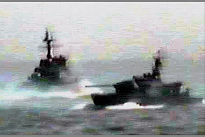 圖:朝鮮警備艇與韓國海軍高速艦在海面對峙 2002年06月29日 19:57 ![]() 韓國和朝鮮艦艇今晨在黃海海面發(fā)生交火,造成韓方4人死亡,至少18人受傷。此圖顯示朝鮮警備艇(右)與韓國海軍高速艇正在對峙之中。圖片為現(xiàn)場韓國海軍作戰(zhàn)部隊攝像機拍攝。(韓國聯(lián)合通訊社圖) 相關(guān)報道:韓國總統(tǒng)金大中的小兒子涉嫌受賄等罪出庭受審 相關(guān)報道:事件綜述:朝韓雙方互相指責(zé) 稱將采取應(yīng)對措施 相關(guān)報道:韓朝海上交火事件:韓軍艇長等4人死亡22人受傷 相關(guān)報道:朝韓艦艇在海上交火 金大中今晚不看世界杯比賽 相關(guān)報道:新聞背景:1998年至今韓朝兩國海難事故大事記 相關(guān)報道:圖文:朝鮮和韓國軍艦發(fā)生交火 4名韓國人死亡