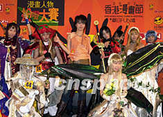 ![]() 歌星梁詠琪23日在香港出席第四屆香港漫畫節(jié)舉辦之《2002漫畫人物扮(左口右野)大賽準(zhǔn)決賽》出任嘉賓,賽后與部份入圍決賽的參加者一起合照。鄧慶樂 攝