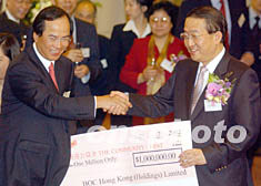 ![]() "中銀香港(控股)有限公司"7月25日成功在香港上市掛牌后,中國(guó)銀行副董事長(zhǎng),中銀香港(控股)有限公司、中國(guó)銀行(香港)有限公司副董事長(zhǎng)及總裁劉金寶(右)向香港公益金籌款委員會(huì)主席柯清輝贈(zèng)送一百萬(wàn)港元支票。任晨鳴 攝