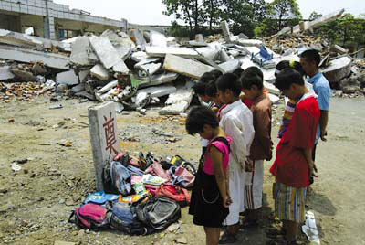“5·12 ”地震發(fā)生后,四川德陽什邡市一名從廢墟中爬出來的13歲小孩,曾英勇救出3名同學(xué)和一名懷孕教師。昨天,該少年來到學(xué)校倒塌的校舍里刨出10余個(gè)書包,將它們整整齊齊地?cái)[放在廢墟旁邊一塊寫有“奠”字的碑前,然后與其他同學(xué)一道默哀3分鐘,以此方式來陪伴遇難的同學(xué)一起過兒童節(jié)。