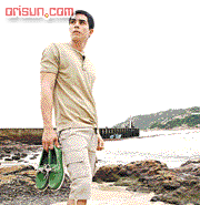 卡其色短袖 T-shirt 、杏色麻質(zhì)短褲配綠色帆船鞋