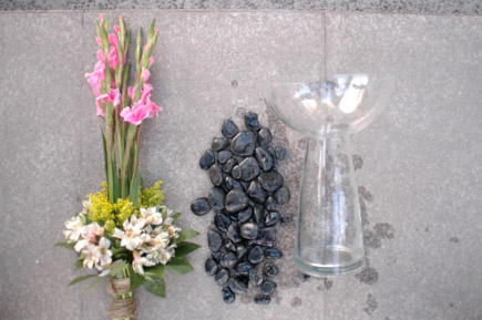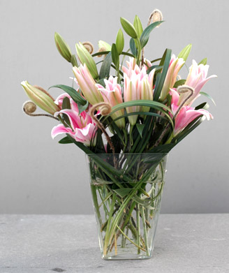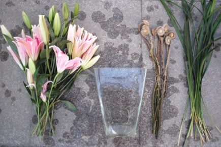 1將劍蘭、黃鶯和水仙百合以螺旋手法用手做出形狀。