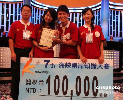 來(lái)自廣州中山大學(xué)的選手黃牧云 、萬(wàn)昊 、施其靚(右一至右三)奪得總分第一并獲得十萬(wàn)元新臺(tái)幣的獎(jiǎng)學(xué)金。中新社發(fā) 耿軍 攝
