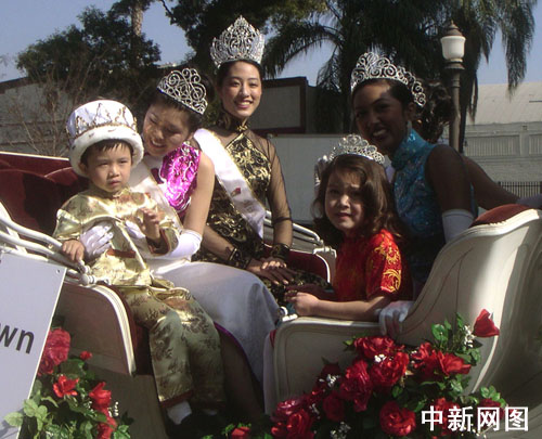 美國洛杉磯二00六年華埠小姐和華埠小皇帝、小皇后一起乘坐玫瑰花車與華人華僑歡聚。作者 賈國榮