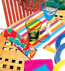 傳統(tǒng)的紅底大花圖案棉布,配合彩色條紋布料或單色棉布,就成了透著含蓄而高貴韻味的餐墊。如配套使用彩色餐具,可增加明快的現(xiàn)代感。