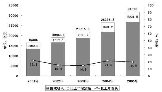 圖表二 “十五”期間全國財(cái)政收入及其增長情況