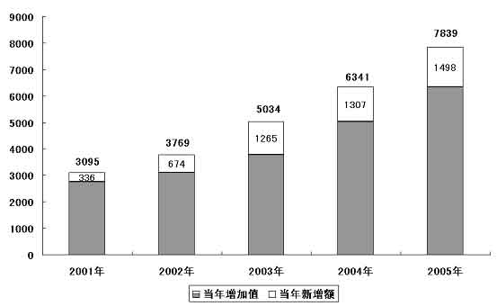 圖表四 “十五”期間規(guī)模以上高技術(shù)產(chǎn)業(yè)增加值增長情況 (單位:億元)