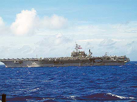 6月17日下午,來自中國、澳大利亞、印度、日本、韓國、俄羅斯、新加坡等7個國家的觀摩團(tuán)分為3個小組,分別乘坐運(yùn)輸機(jī)前往關(guān)島附近海域參觀美軍“里根”號、“林肯”號和“小鷹”號航空母艦。