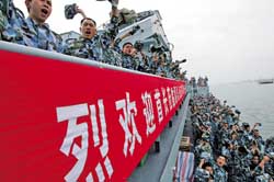 軍艦解纜離港的瞬間,列隊(duì)右甲板的官兵中間,突然爆發(fā)出一陣陣豪邁而又深情的呼喊:“戰(zhàn)友再見!親人再見!”喊聲如驚雷,滾過大海,躍上云霄,震撼心扉,令人動(dòng)容。