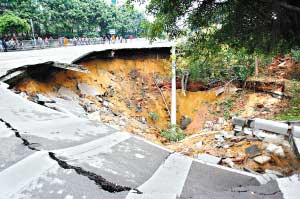 昨日下午4時許,記者來到事故現(xiàn)場,窟窿剛好處于雙橋路和珠江大橋的引橋交界處, 面積大約有100平方米,深約5米?吡倪吘墸嗟穆访嫠榱,讓人覺得隨時可能會掉進(jìn)里面。原本在路邊的一根路燈栽入了窟窿中,兩棵樹也陷了進(jìn)去。警方在現(xiàn)場拉起了警戒線,地鐵公司等相關(guān)部門的工作人員正緊張?zhí)幚怼?/p>