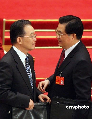 3月8日,十一屆全國人大一次會議第二次全體會議在北京人民大會堂舉行。胡錦濤、溫家寶在主席臺上交談。中新社發(fā) 張宇 攝