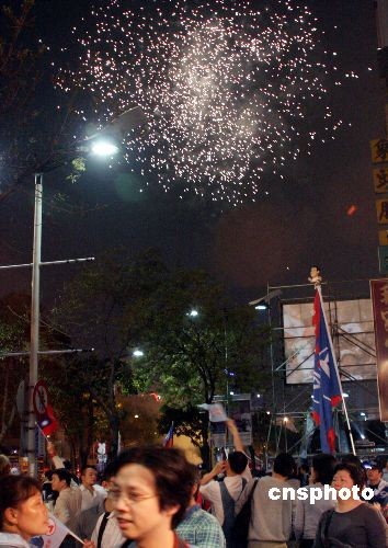 3月22日,中國國民黨候選人馬英九、蕭萬長在臺灣地區(qū)領(lǐng)導人大選中以221萬票的領(lǐng)先優(yōu)勢獲勝。圖為當日晚間在馬蕭競選總部前的集會上,支持者放焰火慶祝。中新社發(fā) 黃少華 攝