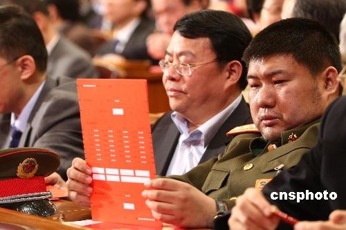 3月13日下午,全國政協(xié)十一屆一次會議在北京人民大會堂舉行第四次全體會議,選舉賈慶林為新一屆政協(xié)主席,王剛等二十五人為副主席,錢運錄兼任秘書長,同時選舉產生二百九十八名政協(xié)常委。圖為毛澤東之孫毛新宇委員(右)在投票前細覽選票。中新社發(fā) 盛佳鵬 攝