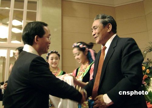 原全國人大常委會副委員長、西藏自治區(qū)發(fā)展咨詢委員會名譽主任熱地十九日在北京說,西藏實現(xiàn)良性發(fā)展,青藏鐵路是最有效的戰(zhàn)略依托。圖為他在西藏大廈為第二屆西藏自治區(qū)發(fā)展咨詢委員會委員獻哈達,鼓勵五十九位知名專家學(xué)者為西藏發(fā)展建設(shè)服務(wù)。中新社發(fā) 劉舒凌 攝