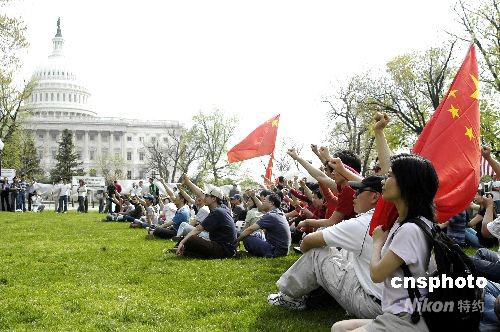 當?shù)貢r間4月19日,近千名中國留學生和當?shù)氐娜A僑華人在美國國會山前舉行示威活動,支持北京奧運,反對CNN丑化中國的評論。圖為千名留學生在國會山前振臂高呼:“不要歪曲報道!不要支持暴力!支持和平,支持奧運!” 中新社發(fā) 邱江波 攝
