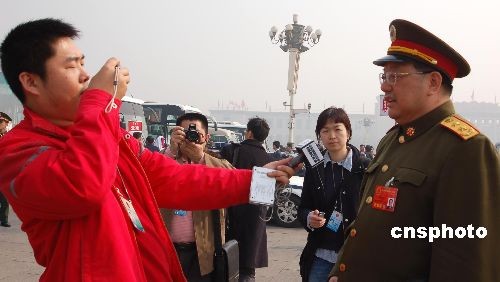 3月10日,十一屆全國人大一次會議在北京人民大會堂舉行第三次全體會議。一名記者在會場外的天安門廣場抓住一名解放軍中將采訪,因?yàn)闄C(jī)會難得,一手拿話筒、一手握相機(jī)著實(shí)忙活。中新社發(fā) 劉萬強(qiáng) 攝