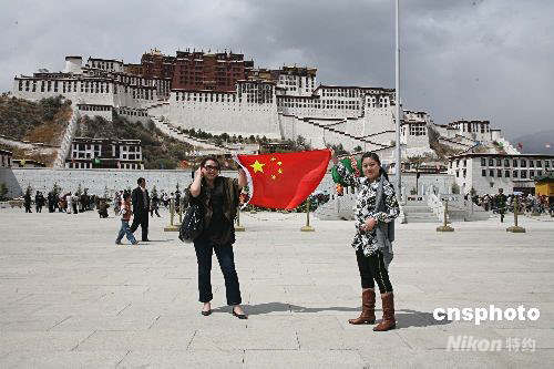 圖:游客布達(dá)拉宮前展國旗支持奧運(yùn)