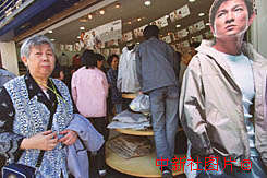 北京的名牌服裝專賣店在門口打出香港影視歌三棲明星劉德華的巨幅照片,以吸引更多的顧客。中新社記者 張勤 攝