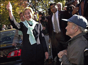 圖文:美國第一夫人希拉里當(dāng)選紐約州參議員 2000年11月8日 10:49 希拉里成為紐約州的參議員。 中新網(wǎng)北京11月8日消息:美國第一夫人希拉里,成功擊敗對手拉齊奧,為民主黨在紐約州奪得一個參議員席位,從而她踏上政治舞臺邁進了一大步。 綜合外電報道希拉里是美國歷史上首位從政的第一夫人。為了這次選舉,西拉里專程從華盛頓搬到紐約州居住。美國總統(tǒng)克林頓在選舉前表示,會全力支持希拉里參政。  |