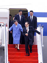 ![]() 何厚鏵陪江澤民與王冶坪下機(jī).國家主席江澤民與夫人王冶坪在澳門特區(qū)行政長官何厚鏵的陪同下,于19日下午乘專機(jī)抵達(dá)澳門機(jī)場,出席澳門回歸祖國一周年慶典活動,江澤民主要陪同人員錢其琛等同機(jī)抵達(dá)。中新社傳真  滿會喬攝  |