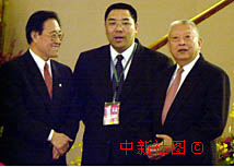 圖片:董建華與宗光耀、長崔世安一起交談 2000年12月19日 21:33 ![]() 中華人民共和國澳門特別行政區(qū)成立一周年慶祝晚宴十九日在澳門綜藝館舉行,香港特區(qū)行政長官董建華(右一)在宴會(huì)上與澳門中聯(lián)辦副主任宗光耀、澳門特區(qū)社會(huì)文化司司長崔世安(中)一起交談。中新社傳真  宗金柱 攝