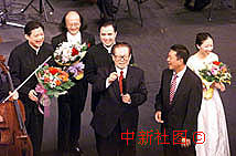 圖片:江澤民主席與全場觀眾,齊唱《歌唱祖國》 2000年12月20日 16:13 江澤民主席與何厚鏵、陳燮陽、孔祥東、莫華倫、林盈盈以及全場觀眾,齊唱《歌唱祖國》。中新社傳真  滿會喬 攝