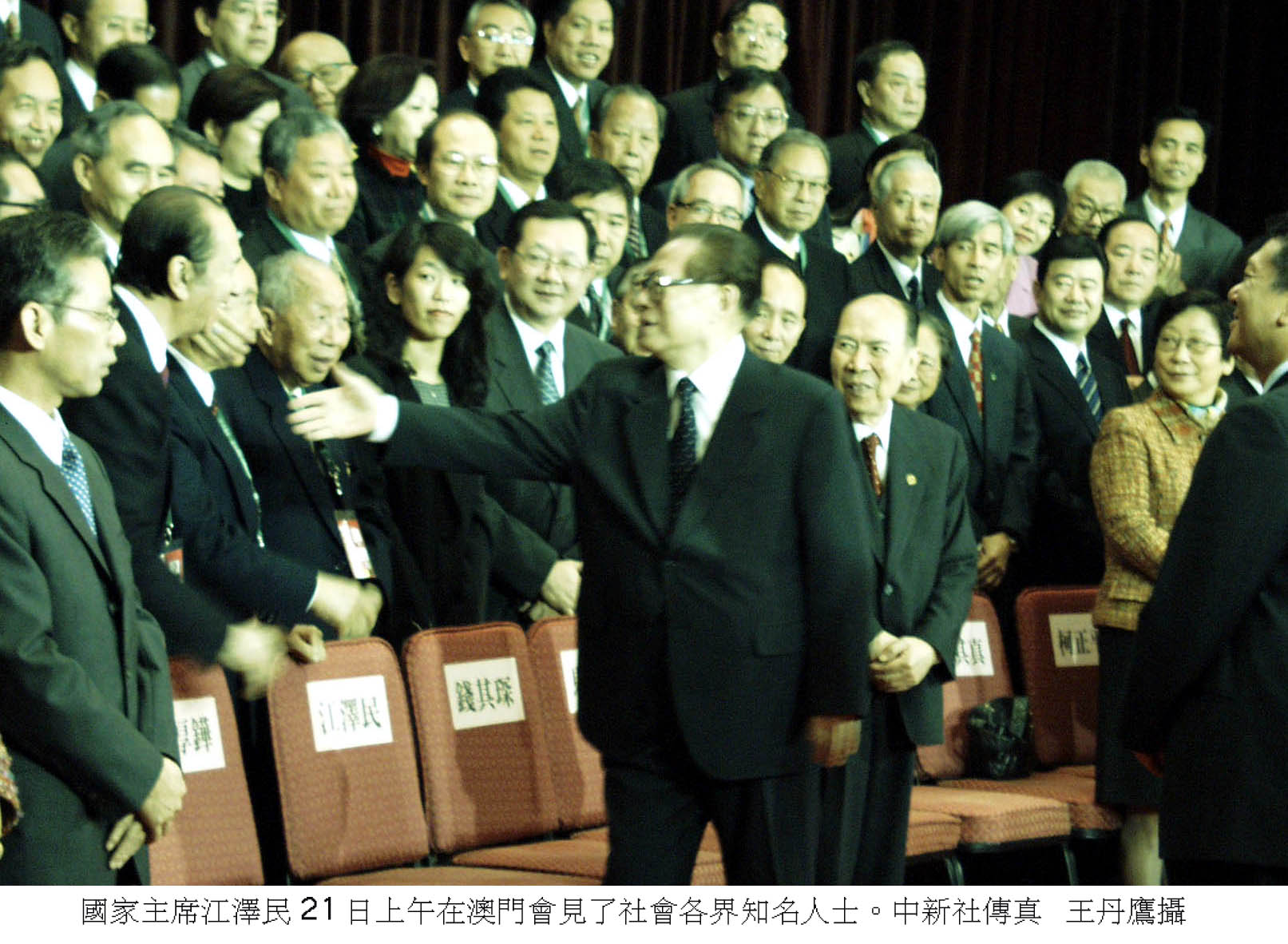 特寫:江澤民主席與澳門各界知名人士談心 2000年12月21日 14:34 ![]() 國(guó)家主席江澤民21日上午在澳門會(huì)見了社會(huì)各界知名人士 中新社澳門十二月二十一日電題:特寫:“冬天來(lái)了,春天還會(huì)遠(yuǎn)嗎?”──江澤民主席與澳門各界知名人士談心