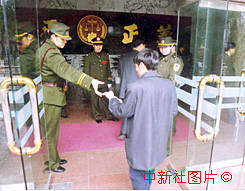 原江西省副省長胡長清一案十五日在南昌市公開宣判,審判庭約千余旁聽席坐無虛席。圖為南昌市中級(jí)人民法院的法警在第二道入場的關(guān)卡處驗(yàn)票。中新社記者 段八一 攝