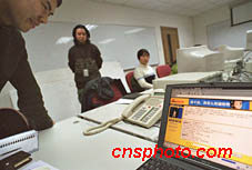 2月5日晚,有“歌壇常青樹(shù)”美譽(yù)的臺(tái)灣歌手蔡琴在臺(tái)灣通過(guò)長(zhǎng)途電話與新浪網(wǎng)友進(jìn)行聊天。蔡琴還將于2月14日至17日在北京領(lǐng)銜主演的大型音樂(lè)劇《天使--不夜城》。圖為工作人員在通過(guò)電話聯(lián)系蔡琴,電腦里正顯示著有關(guān)蔡琴資料的主頁(yè)。中新社圖 陸云 攝