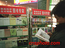 以“反對邪教、維護(hù)穩(wěn)定、崇尚科學(xué)、傳播文明”為主題的“青年文明社區(qū)反邪教行動”近日在北京市全面啟動。北京圖書大廈特設(shè)“反邪教”圖書專柜,一位年青人認(rèn)真翻閱宣傳圖書。中新社圖 陸云 攝