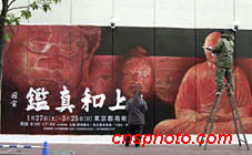 中國唐代高僧鑒真東渡日本,帶來大量中國先進文化,成為中日友好交流的象征。時隔一千多年,鑒真至今仍深受日本人民尊敬,東京美術館今春舉辦為期兩個月的“鑒真和尚展”。圖為兩名工作人員在東京鬧市區(qū)涉谷描繪巨幅展覽廣告畫。中新社圖 陶光雄 攝
