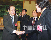國務(wù)院副總理錢其琛八日在北京人民大會堂臺灣廳,向出席全國政協(xié)大會的臺灣婦女代表祝賀節(jié)日。中新社記者 宋吉河 攝