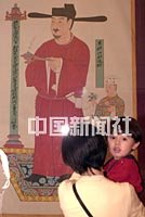 “張大千臨摹敦煌壁畫及大風(fēng)堂用印展”十八日在澳門文化中心舉行,展出著名畫家張大千于四十年代臨摹敦煌莫高窟壁畫的一百三十三幅作品,圖為觀眾觀看一幅五代時期壁畫的的設(shè)色絹摹本。中新社傳真 宗金柱攝