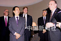國務(wù)院副總理錢其琛當?shù)貢r間十九日會見美國工商界人士時說,他明日將與美國主流媒體負責人共進早餐。美國大公司的老板們對錢其琛開玩笑說:“那他們肯定會提很多問題難為你的!辟e主聽后大笑。中新社圖 陳建 攝