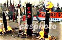 四月七日,韓國市民、學(xué)生在首都漢城集會,抗議美國導(dǎo)彈防御系統(tǒng)和日本通過的美化侵略的歷史教科書。圖為示威群眾當眾焚燒了美、日兩國國旗和用紙糊制的導(dǎo)彈模型。中新社圖
