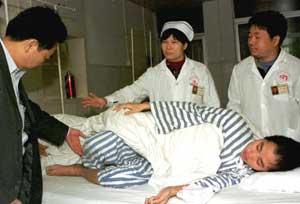 圖文:昔日跳樓“護(hù)法” 如今重獲新生 2001年4月11日 14:26 ![]() 因跳樓造成四肢、腰椎骨折的高州市“法輪功”輔導(dǎo)站站長(zhǎng)劉冰,在高州市人民醫(yī)院醫(yī)護(hù)人員的精心救治下,身體恢復(fù)很快,已無(wú)終生殘疾危險(xiǎn)。(周文杰 攝) 中新網(wǎng)高州四月十一日消息:廣東省高州市一批“法輪功”癡迷者近日在當(dāng)?shù)卣汀胺ㄝ喒Α鞭D(zhuǎn)化人員的幫教下,終于迷途知返,重獲新生。 2000年12月,劉冰、伍文瓊等13名法輪功癡迷者在北京跳樓“護(hù)法”,造成1死4重傷的慘劇。高州市委市政府將他們接回后,結(jié)合當(dāng)?shù)厍闆r展開(kāi)了一場(chǎng)全社會(huì)共同參與的挽救行動(dòng)。到目前為止,全市包括他們?cè)趦?nèi)的140名“法輪功”癡迷者中,已有86%得到轉(zhuǎn)化。(據(jù)新華社) |