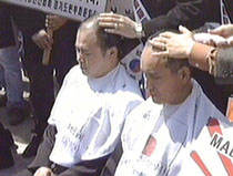 近日,日本文部省通過美化侵略的歷史教科書以來,韓國各界反應(yīng)強(qiáng)烈。全國各地不斷有游行、焚燒日貨的抗議活動。圖為漢城民眾當(dāng)眾剃成光頭以示抗議。韓國民眾把頭發(fā)看作先人所賜,只有非常憤怒、失望時才會剃光頭。