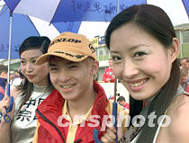 中國香港車手周浩云(中)與內地名模金姝懿(右)、王茵(左)在捷克布諾賽車場,為中國宗申摩托車隊取得歷史性好成績喜笑顏開。中新社圖 方迎忠 攝