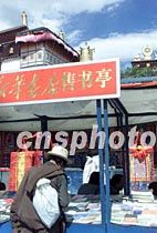 西藏拉薩大昭寺前的新華書店吸引了遠(yuǎn)道前來朝圣的藏民駐足觀看。西藏藏民的文化生活水平日漸提高。中新社記者 滿會(huì)喬 攝