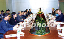 二○○一年APEC貿(mào)易部長會議將于六月六日開幕。會議主席、中國外經(jīng)貿(mào)部部長石廣生和中國代表團(tuán)團(tuán)長、外經(jīng)貿(mào)部首席談判代表龍永圖,五日在上海國際會議中心與經(jīng)濟(jì)體代表團(tuán)團(tuán)長舉行雙邊會談。圖為石廣生與美國貿(mào)易談判代表羅伯特·佐立克一行會晤。中新社記者 潘索菲 攝